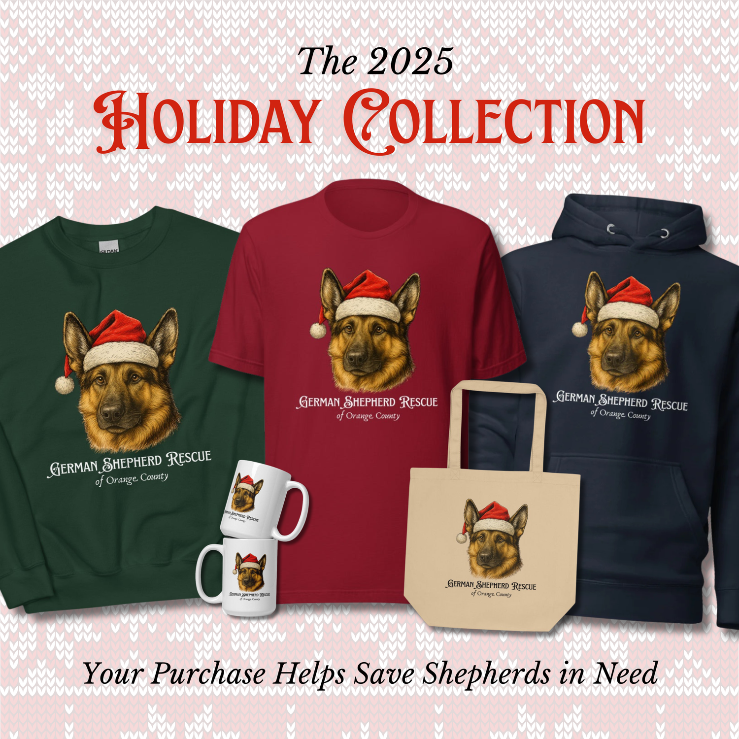 Our 2025 Holiday Collection is filled with cozy, heartfelt gifts that directly support the dogs of German Shepherd Rescue of Orange County. Every purchase helps fund life-saving medical care, nutritious food, training, and the safe haven each dog deserves.